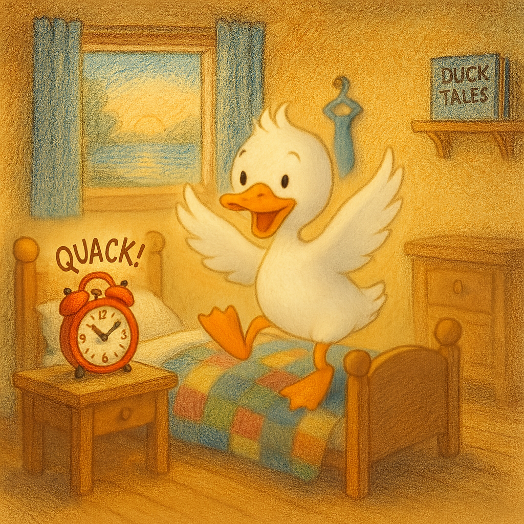 It was Monday morning when Dudley the Duck’s little red alarm clock gave a loud quack!